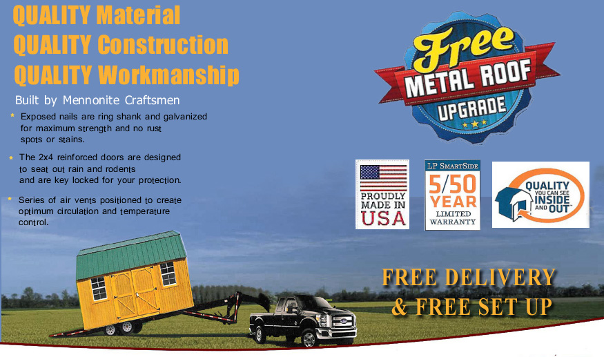 - 30 year metal roof – All of our metal buildings come with #1 grade, 29 gauge commercial metal roofs. This is also available as an option on pressure treated and painted buildings.
